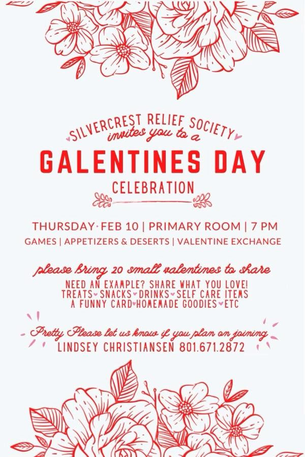 Thursday, February 10th is the date for the Relief Society Galentine’s Day get-together. All women are invited at 7:00 p.m. for games, appetizers, desserts, and a valentine exchange. The organizers invite attendees to bring 20 small valentines to share, if possible. See the associated flyer for more details and contact Sister Lindsey Christiansen to RSVP.