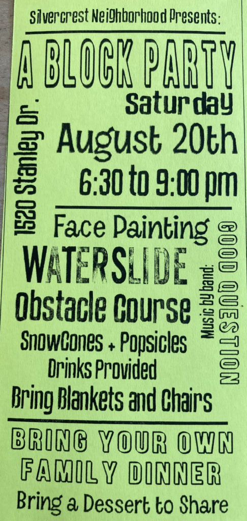 The annual Silvercrest Neighborhood Block Party is set for Saturday, August 20, 2022! Everyone is invited to come for drinks, desserts, and delights of all the best kinds. Check the flyer below for details! Bring your friends and family for tasty treats, great music, and good company!