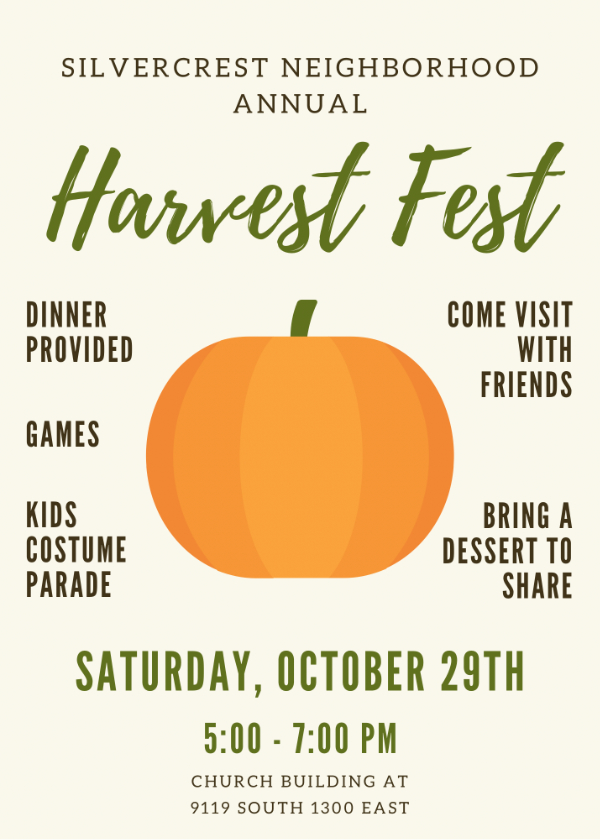 Our annual fall festival is here! Dinner will be provided. Bring a dessert to share and enjoy games, a kids’ costume parade, and more. See the flyer above for details.