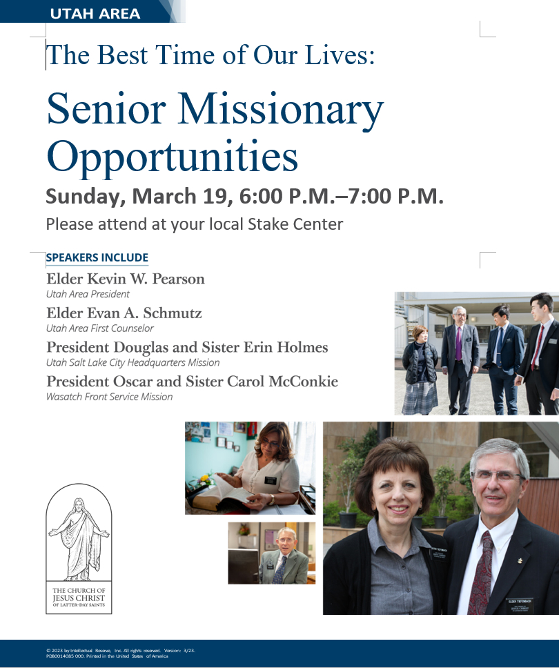 We encourage all senior adults to attend to receive instruction from our Utah Area Presidency: Elder Kevin Pearson, Elder Evan A. Schmutz, and Utah Salt Lake City Headquarters Mission: President Douglas and Sister Erin Holmes; and the Wasatch Front Service Mission- President Oscar and Sister Carol McConkie.
