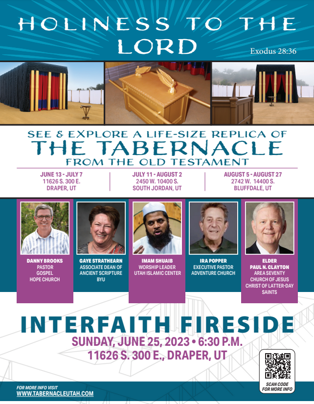 The Old Testament Tabernacle replica is now open and will run through Friday, July 7th . It’s located at 11626 S. 300 East in Draper. As a reminder, tickets are not required to participate in the Tabernacle Experience. Associated with the Tabernacle Experience is an Interfaith Devotional on Sunday, June 25th at 6:30 p.m. This will be an amazing opportunity for the members of our stake, as well as those of other denominations, to come and learn what the Old Testament Tabernacle means to our respective faiths.