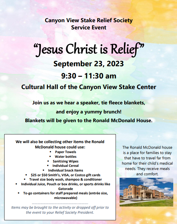 The Canyon View Stake will be holding a service event on Saturday, September 23, 2023. The event will include a speaker, brunch for the attendees, and service to benefit the Ronald McDonald House.