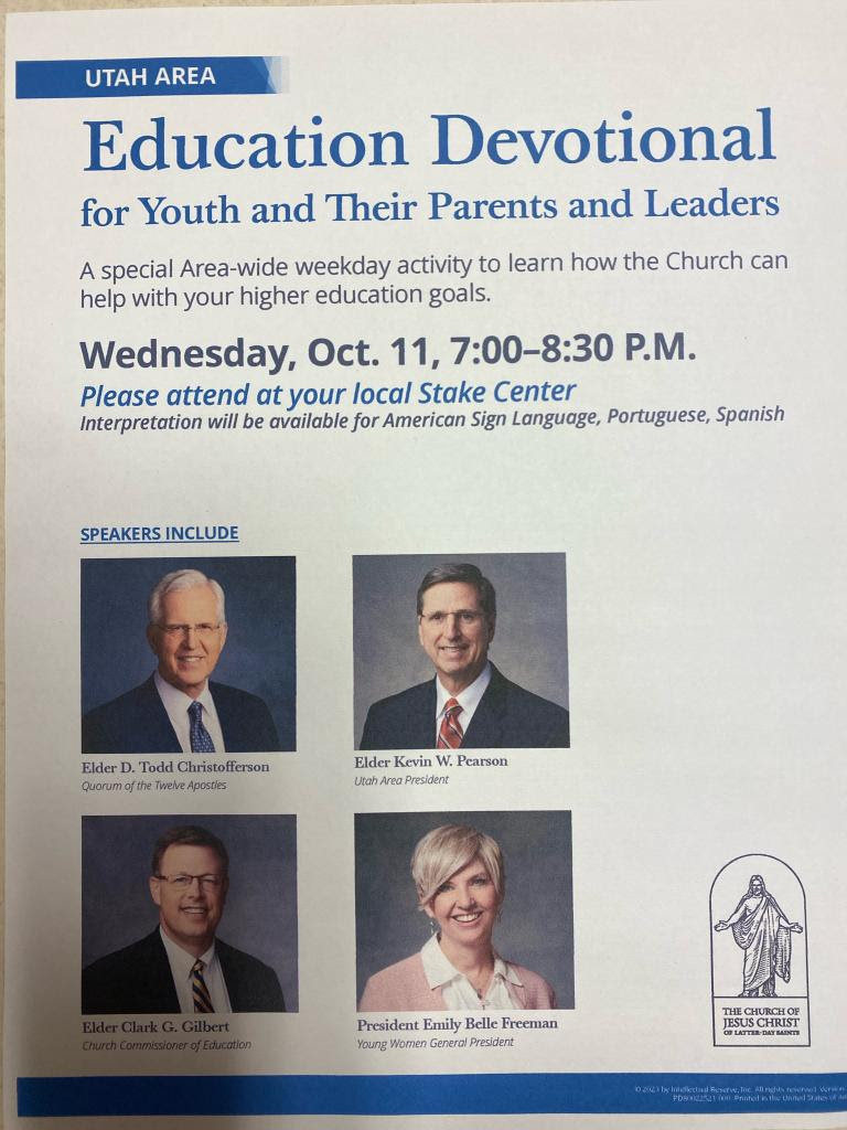 There will be a devotional presented focusing on higher education on Wednesday, October 11 from 7:00 p.m. to 8:30 p.m. at the Canyon View Stake Center. For complete details, please check out the attached flyer. See you there!