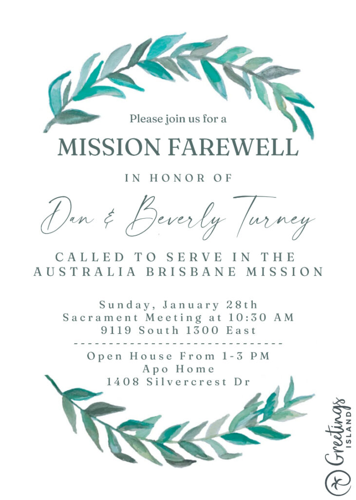 It’s off to Australia for the Turney’s! They have received a call to serve in Brisbane as a missionary couple. An Open House is scheduled for Sunday, January 28, 2024 following a Sacrament Meeting where the Turney’s will be speaking.