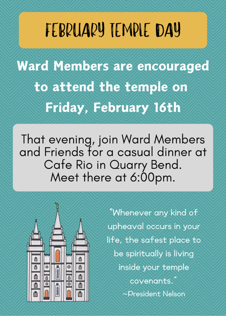 The ward would like to resume group temple sessions and social gathering with an excursion this week for all who would like to get together. Feel free to attend a temple session at any time on Friday, February 16, 2024, meet for dinner, or both as schedules allow.