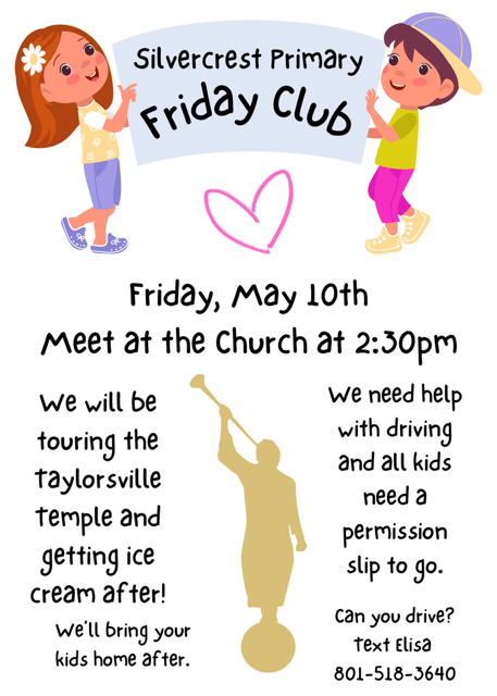 The Primary will be hosting a field trip for their upcoming Friday Club with Friends Event. All friends and neighbors of Primary age are invited to go to the Taylorsville Temple Open House. There will also be ice cream following the tour!
