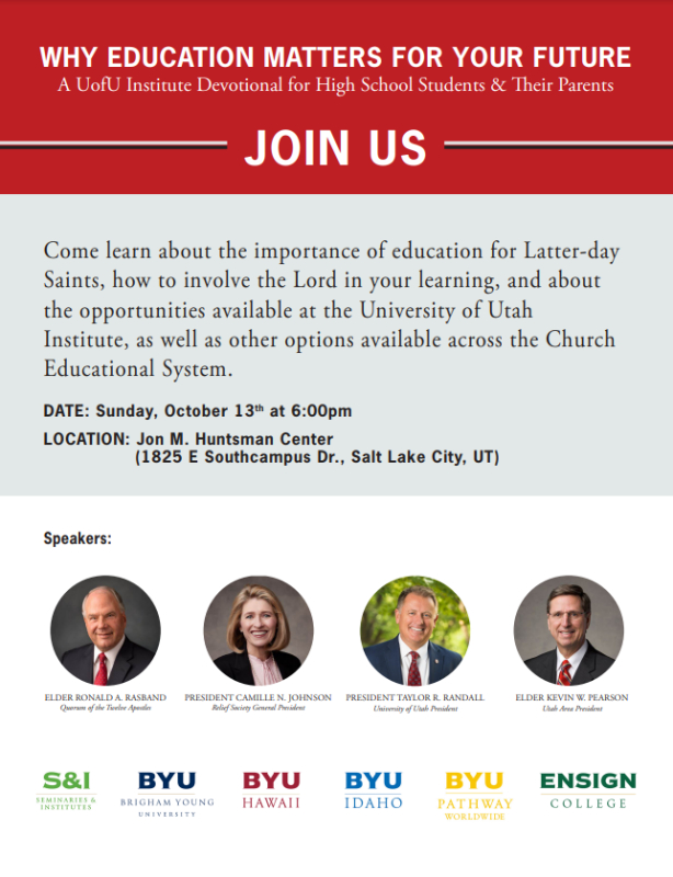 The U of U Institute invites all high school students and their parents to join an Education Devotional in October.