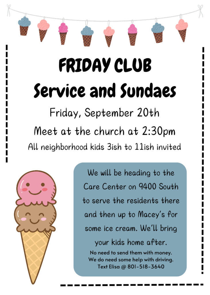 The Friday Club for kids has another great event in September! They will be doing service at the Care Center and then going for ice cream at Macey’s! All children from 3 years-old (or so) to 11 years-old (or so) are invited.