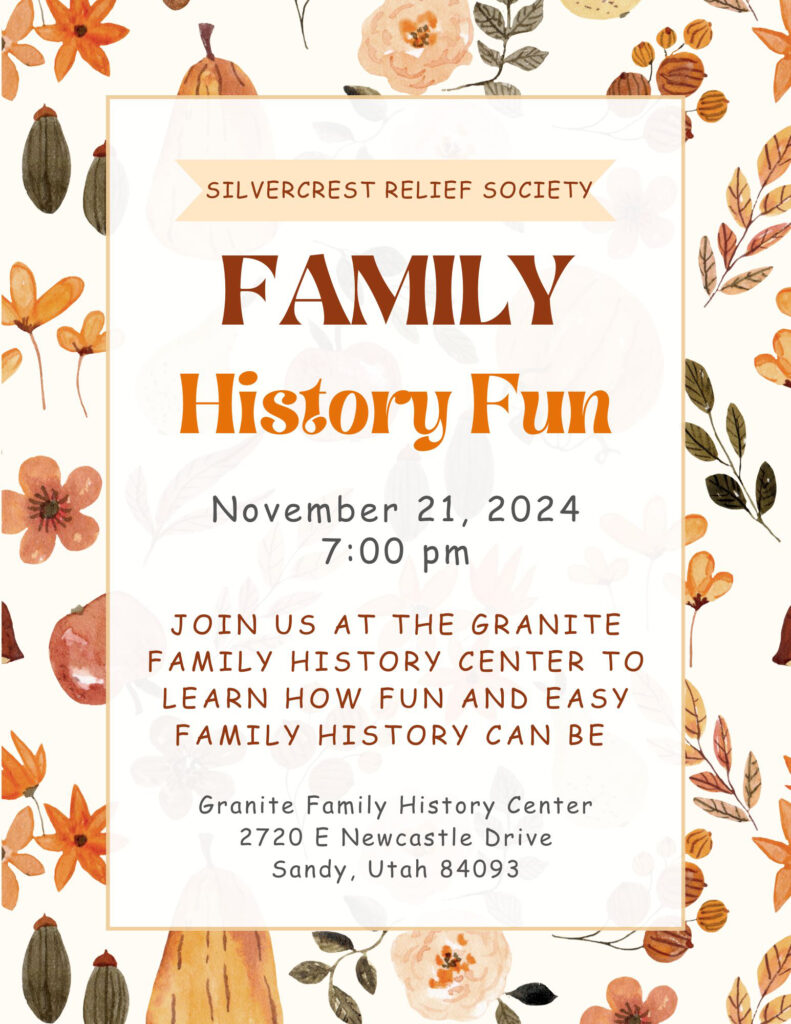 The Silvercrest Ward Relief Society is hosting an evening at the Granite Family History Center. Come learn how fun and easy family history can be!