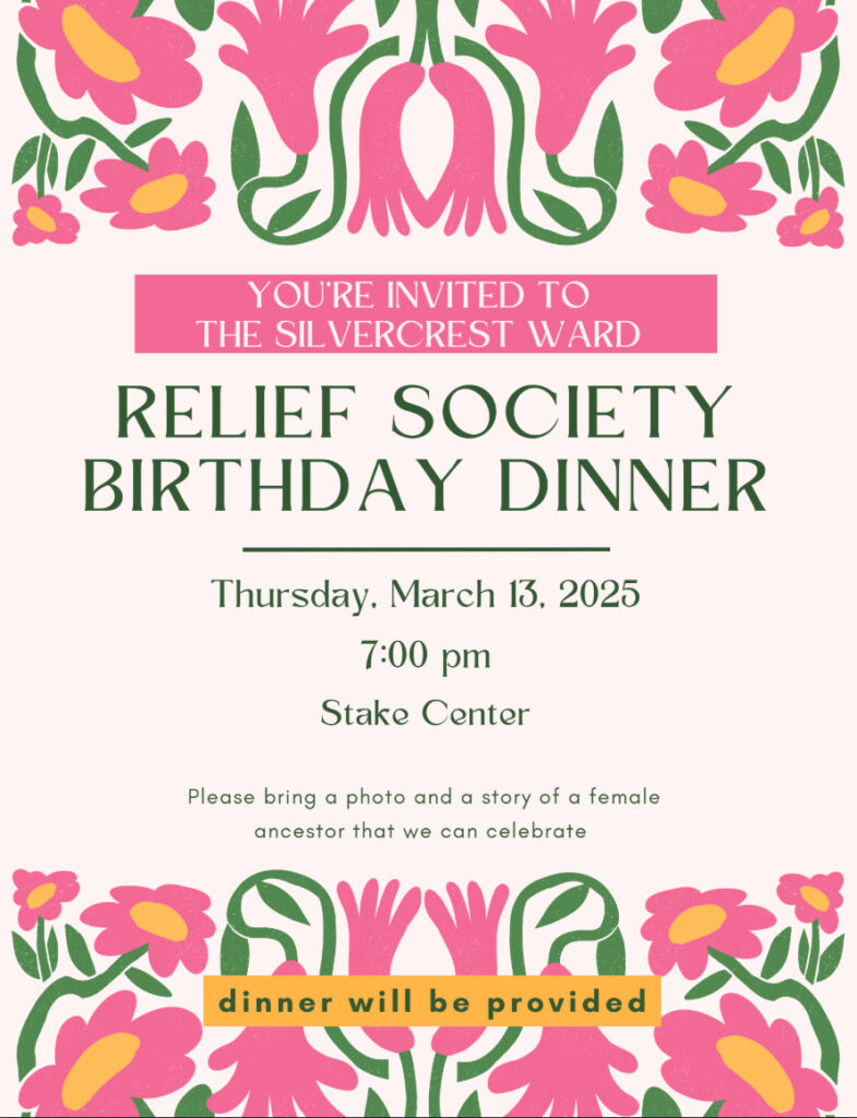 All ward sisters are invited to a special dinner to celebrate the creation of the Relief Society organization! Food will be provided but attendees are asked to bring a photo and a story of a female ancestor to make the occasion even more joyous!