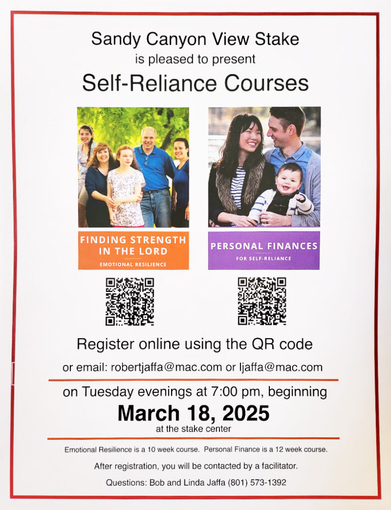 This year, the Stake is offering two courses on self-reliance: “Emotional Resilience” and “Personal Finance.” These courses will be held beginning Tuesday, March 18, 2025 at 7:00 p.m. in the Canyon View Stake Center. You can register with the QR codes included or contact Brother or Sister Jaffe. For complete details, refer to the attached flyer!