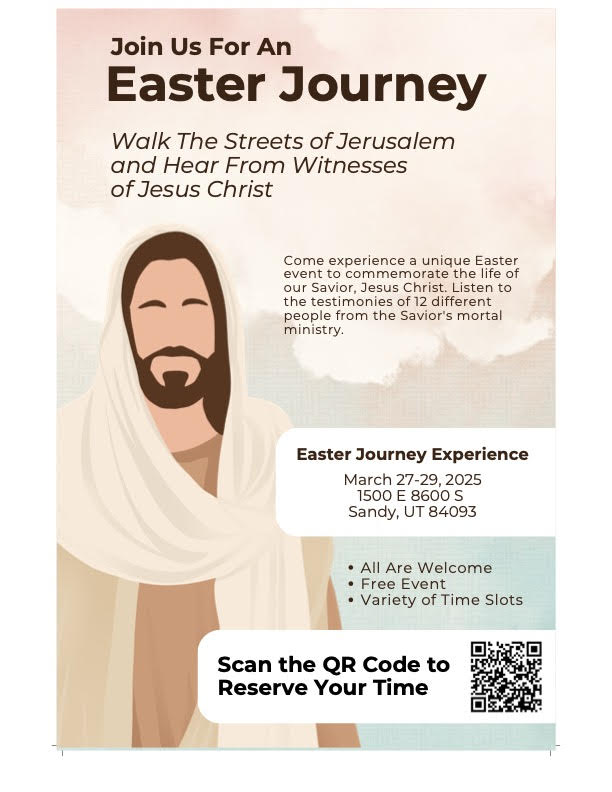 As you celebrate Easter this year, come join us on a journey through the streets of Jerusalem during the last days of Jesus Christ’s mortal ministry. Meet people portraying those who knew Him, and hear their testimonies of His miracles, His love, His teachings, His atonement, and His resurrection.