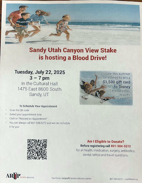 The Sandy Canyon View Stake is bringing back the Summer blood drive. Besides contributing to a worthy cause, donors will be entered to win a $1,500 gift card to Disney Theme Parks!