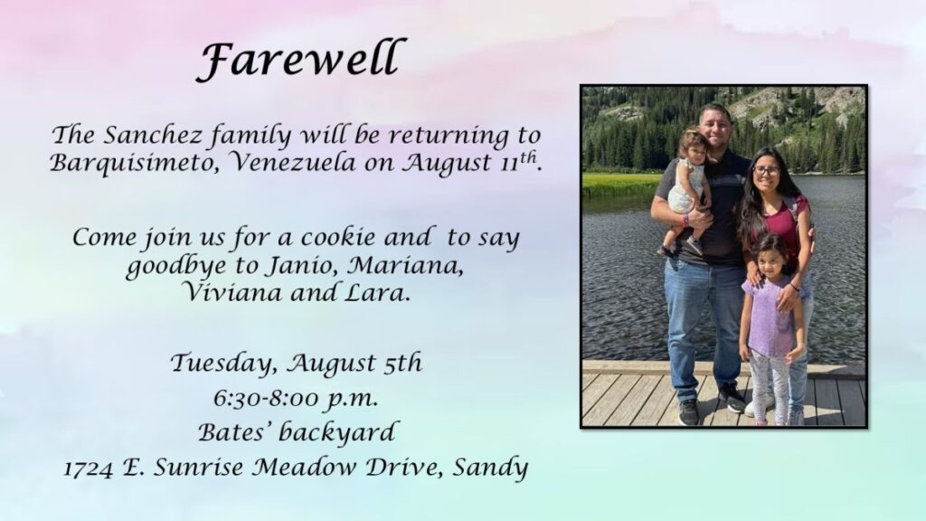 A farewell gathering will be held this Tuesday, August 5, 2025 as we unfortunately must say goodbye to the Sanchez Family. Janio, Mariana, Viviana, and Lara will be returning to Venezuela.