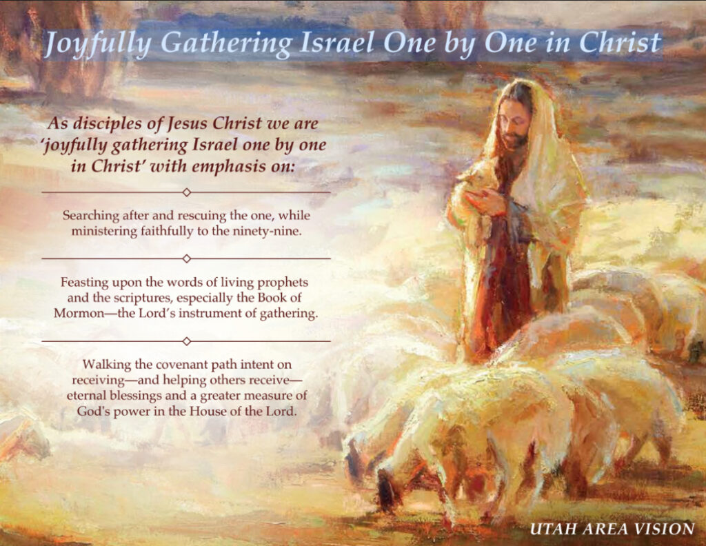 Our second hour meeting this month for Fifth Sunday will be a message prepared by the Utah Area leadership. Titled, “Joyfully Gathering Israel One by One in Christ,” this message will include inspiring thoughts about searching for the one, feasting upon the words of the prophets, and walking the covenant path.