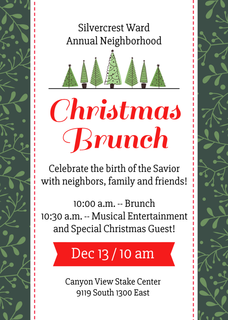 The annual Christmas Brunch is scheduled for Saturday, December 13th. All ward members and neighbors are invited to come and enjoy delicious food, holiday entertainment, and a special visit from everyone’s favorite elf.