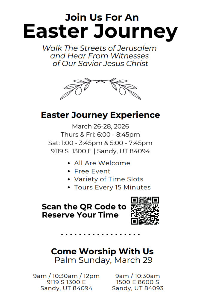 The third annual Easter Journey will be presented by the Canyon View Stake this month. This event brings together the members of the Canyon View stake and has touched the hearts of so many. Share in the experience this year with your family and friends.