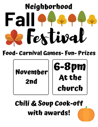 Bring your neighbors and friends to the Fall Festival! There will be contests for the best soup and chili recipes, so get cooking! Side dishes and desserts will also be provided. Activities include carnival games and face painting.